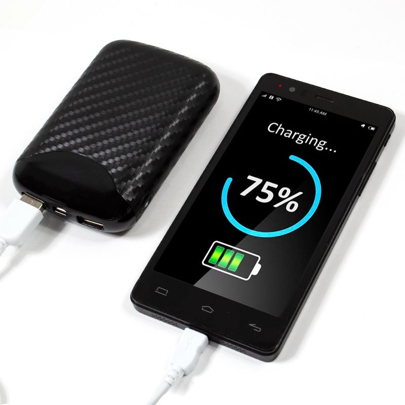 Bateria portátil de alta capacidade para carregar dispositivos electrónicos tais como Smartphones Android, iPhones, iPad, iPod, cameras, videocameras, MP3 / MP4, GPS e outros dispositivos alimentados por 5v com baterias de Iões de Litio recarregáveis.